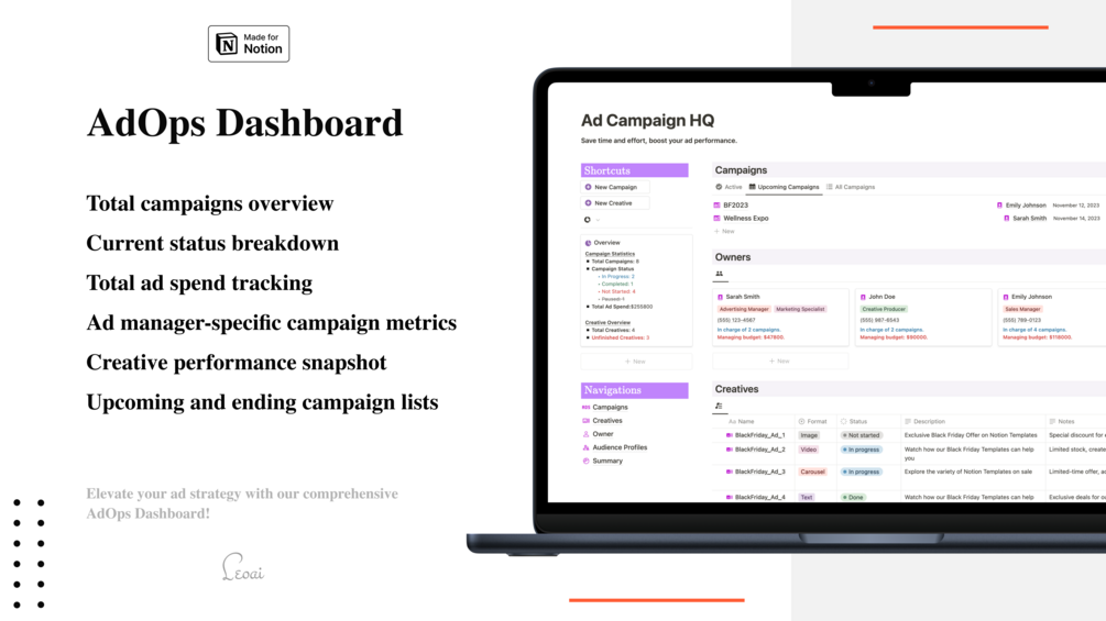 You will get total command over your ad campaigns with Ad Campaign HQ, seamlessly managing audiences, creatives, and budgets.