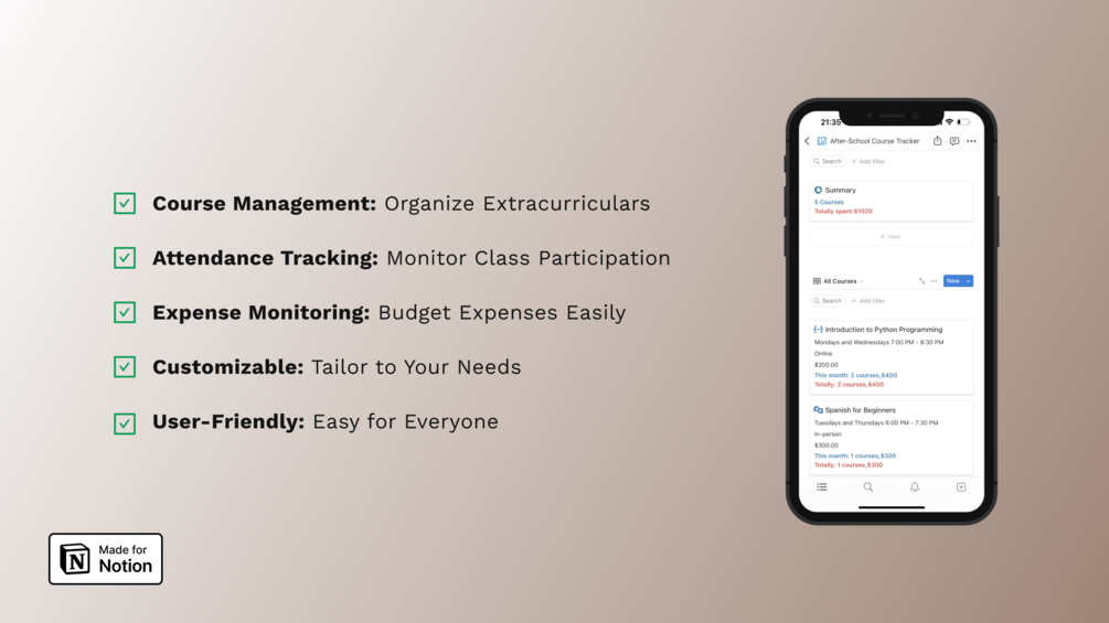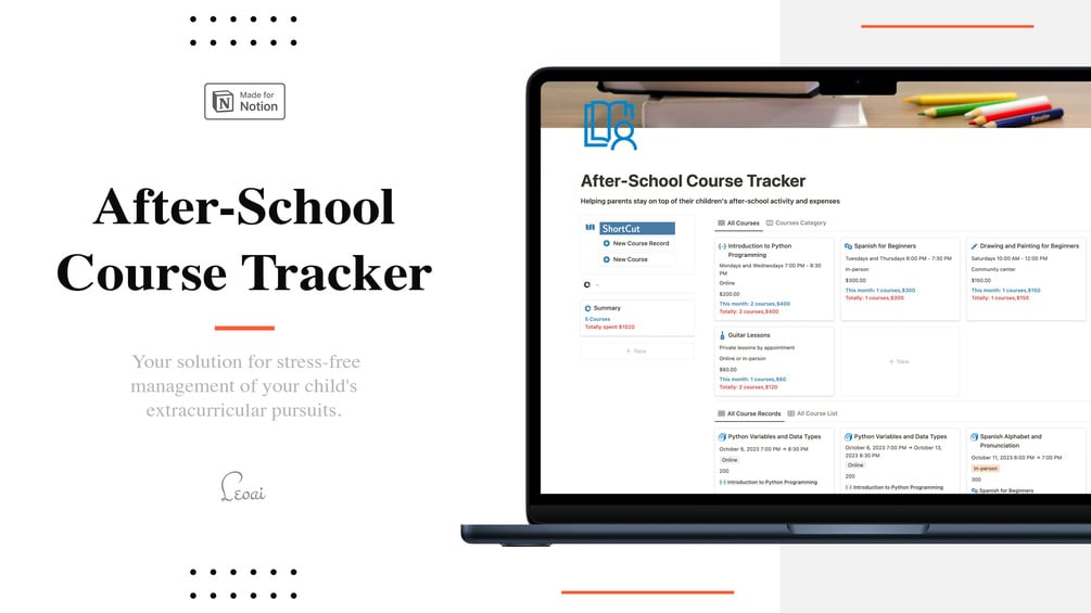 With the "After-School Courses Tracker," you can enjoy the benefits of a well-organized and stress-free approach to managing your child's extracurricular activities. It's time to empower yourself as a parent and provide the best for your child's growth and development.