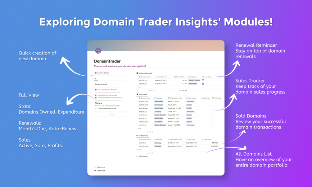 - Sales Status Management and Tracking: Efficiently handle listed domains, while tracking real-time sales statuses.