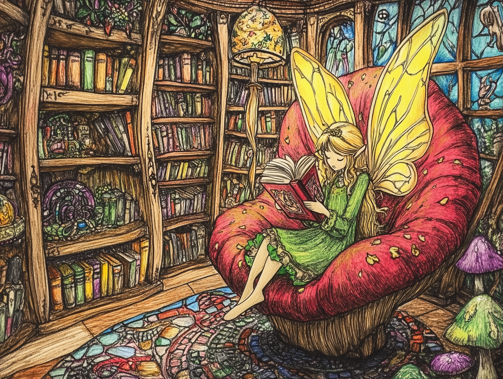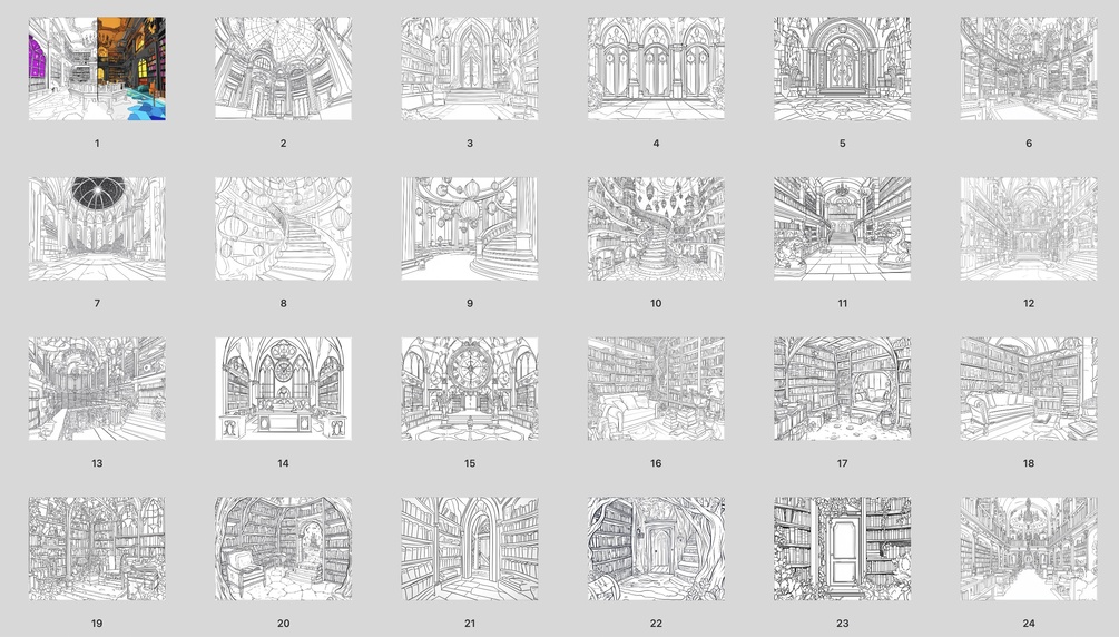 - Diverse and Captivating Scenes: Explore a variety of magical library settings, from the grandeur of its exterior and intricate architectural details to the cozy interior filled with shelves of books, charming reading nooks, elegant staircases, and whimsical windows.